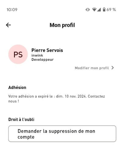 - La page Mon profil va s'ouvrir. Vous pourrez cliquer sur le bouton "Demander la suppression de mon compte" dans la rubrique "Droit à l'oubli".